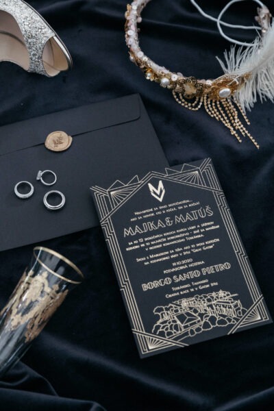 An Extravagant Soirée in a Villa in Tuscany, after a Cozy Wedding in an Abbey.We knew early on that Maria & Matus wanted a two-day wedding in Tuscany, because one day was not enough for all the celebrating they had in mind! On the first day the couple wanted to hold their ceremony in the abbey, and then host a small reception dinner after at Relais Borgo Santo Pietro. And on the second day they wanted to throw a Gatsby inspired wedding and party for their nearest and dearest. As 2020 was such a difficult year for weddings & travel, they were forced to invite only their closest friends and family, so they wanted to make sure the celebration was truly special.